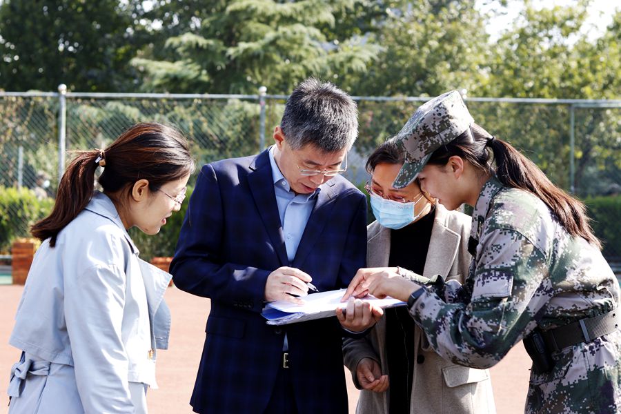 党委书记赵琪、党委副书记孙金玲、团委书记王亚平亲临现场视察指导2022级新生军训工作,慰问承训教官和参训新生。