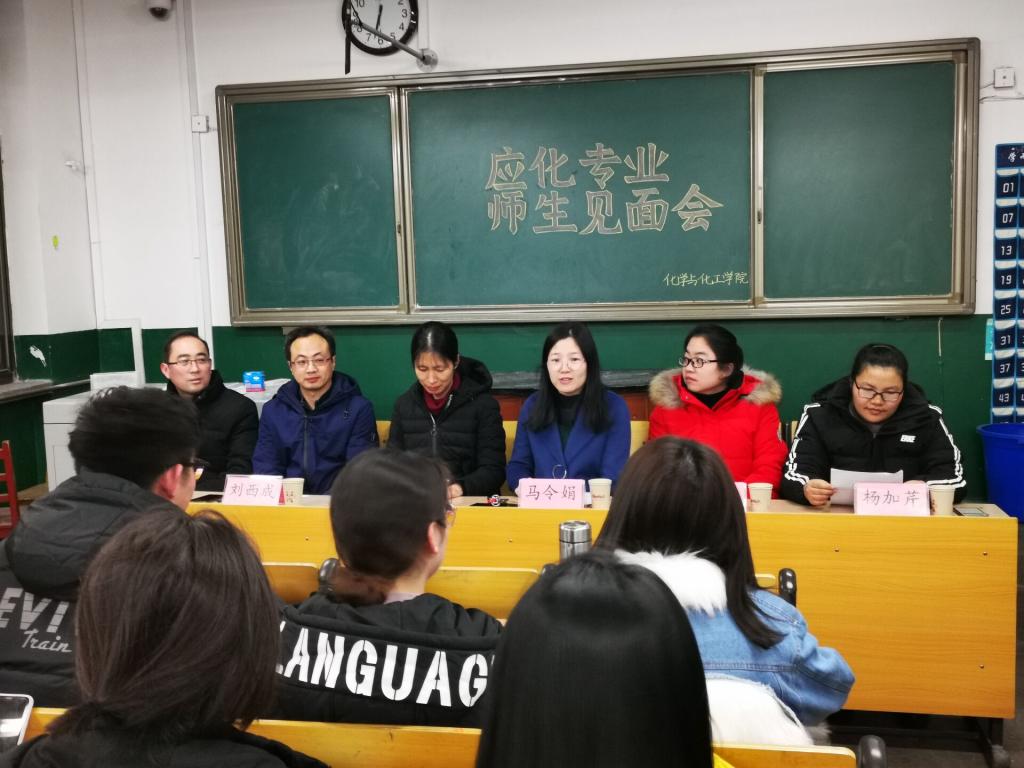 102教室成功举行。应用化学教研室全体教师岳明波、刘西成、马令娟、张世娟、杨加芹和晁绵冉以及2018级应用化学专业全体同学参加了见面会。