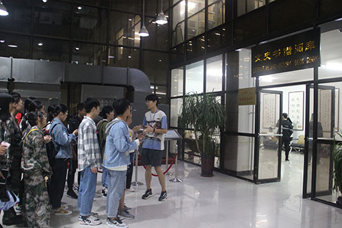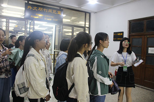 2019级新生在引导员的带领下在图书馆西门集合,依次进入图书馆游览学习。