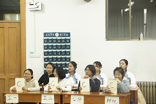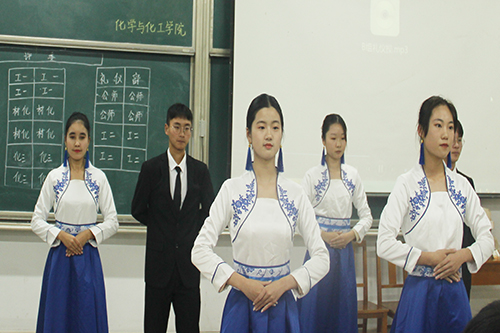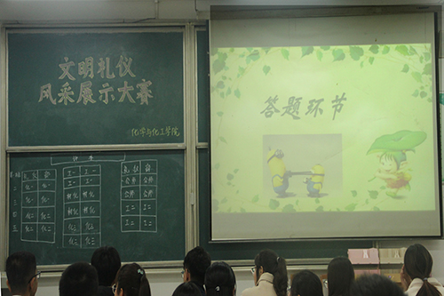 本次大赛由温涵宇和张晓玟主持,大赛一共分为知识问答、礼仪展示、职场礼仪、情景展示四个环节。知识问答环节中,每班派三名代表回答,同学们沉稳思考,踊跃回答;礼仪展示环节中,礼仪部干事进行礼仪示范,各班观摩学习;职场礼仪环节分为打领结和化淡妆两组,礼仪部干事进行示范后,各班参赛选手依据模特自身特点,自由发挥,进行比拼;情景展示环节中,各班依次抽签续演题目,以符合文明礼仪为要求进行故事续演;游戏互动环节中,同学们,热情高涨,积极参与。本次比赛共评选出团体奖前三名,出席嘉宾为获奖班级颁奖:第一名为公费师范生班,第二名为化工与制药类二班,第三名为材料化学班。