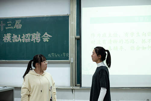 比赛分为初赛和决赛两个阶段,初赛于11月30日在系楼101举行,由王卓、王立涛、李宁、张旭瑞主持,评委为大学生就业服务部部长王旭、信息部部长邵真、科技部部长胡兵、综合治理部部长李炜钰。评委根据简历设计、面试礼仪、语言表达、专业知识、特长等评分标准进行打分,最终选出10名选手进入复赛。决赛于12月7日在综合楼105举行,由王滨和陆鸿亚主持,评委为化工教研室王凤翔老师、王重斌老师,无机化学教研室李梦婷老师。复赛分为简历投递、自我介绍、应聘演说、情景模拟、考官提问五个环节。选手沉稳冷静,灵活应答,表现出对竞选岗位的充足准备。同时以自身经历为切入点,巧妙处理情景问题,充分展示自身优势。评委依据选手表现依次进行点评,肯定选手表现中的优势部分,指出需要进一步完善的地方,并勉励选手保持热情,继续努力。中场穿插“心有灵犀,你比我猜”的小游戏,现场气氛十分活跃。最终根据评委老师打分,比赛决出一等奖一名、二等奖两名、三等奖四名。