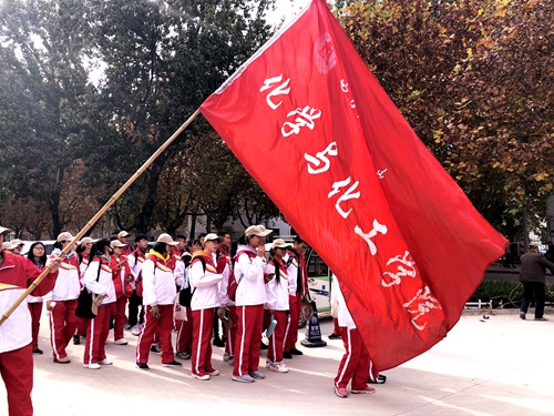 2018级新生在学校墨子像前集合,在辅导员冯德浩、学生会主席宋成凯的带领下前往参观三孔景区。