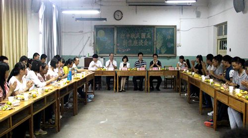 和近年来学院取得的成绩,并给大家送去了节日的祝福。师生围坐在一起聊天,冯媛媛老师指出大学要以学业为重,要求同学们无论做什么事都要把学习放在第一位;岳明波老师建议同学们劳逸结合,多参加体育运动,强身健体;陈光老师建议同学们要树立远大的目标,并为之努力奋斗。三位老师都谈到了自己的大学生活,希望同学们能从中吸取经验,以较好的状态投入到大学生活中。领导老师们与新生的谈话将座谈会的气氛推向最高潮。随后新生进行自我介绍,大家相互了解,师生有说有笑其乐融融。最后,文艺部为大家带来精彩的表演节目,来自新疆的三位新生为大家带来的新疆舞蹈得到大家的一致称赞……欢声笑语中,2015级“迎中秋,庆国庆”新生座谈会落下帷幕。