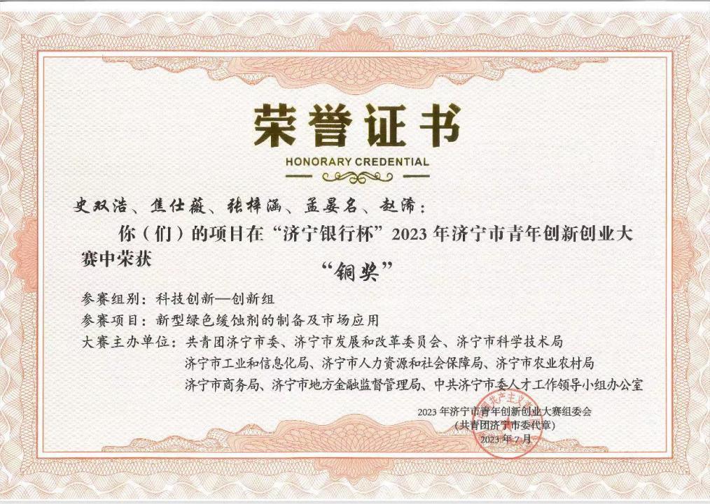 本届大赛聚焦济宁市高质量发展,设置科技创新、乡村振兴等领域,自今年4月份启动以来,吸引了310余个项目参赛,经过激烈角逐,共评选出金奖5个、银奖10个、铜奖15个、优秀奖6个。曲阜师大黄色仓库 史双浩同学的项目《新型绿色缓蚀剂的制备及市场应用》荣获大赛铜奖并获得三万元的创业助推金。