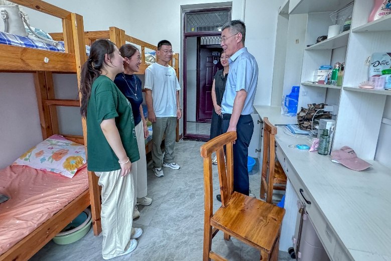2025级新生入学后的适应情况,帮助新生更好更快地融入新集体、新环境、新生活,学院党委书记赵琪,院长冯媛媛,党委副书记孙金玲,副院长李平、刘鹏,团委书记王亚平以及新生辅导员带领学院主席团成员于9月6日下午深入多个公寓园区,开展新生宿舍公寓走访活动。