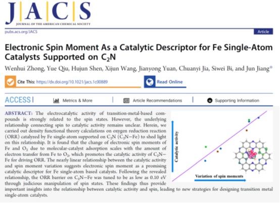 钟文辉副教授与中国科学技术大学江俊教授合作,在自旋催化研究方向取得突破性进展,相关研究成果发表在国际顶级期刊 《美国化学会志》(Journal of the American Chemical Society, JACS)。论文题为“Electronic Spin Moment As a Catalytic Descriptor for FeSingle-Atom Catalysts Supported on C2N” (doi:10.1021/jacs.1c00889)。由美国化学会创办于1879年,是化学类顶级期刊之一。JCR分区为一区,当前影响因子为14.612。