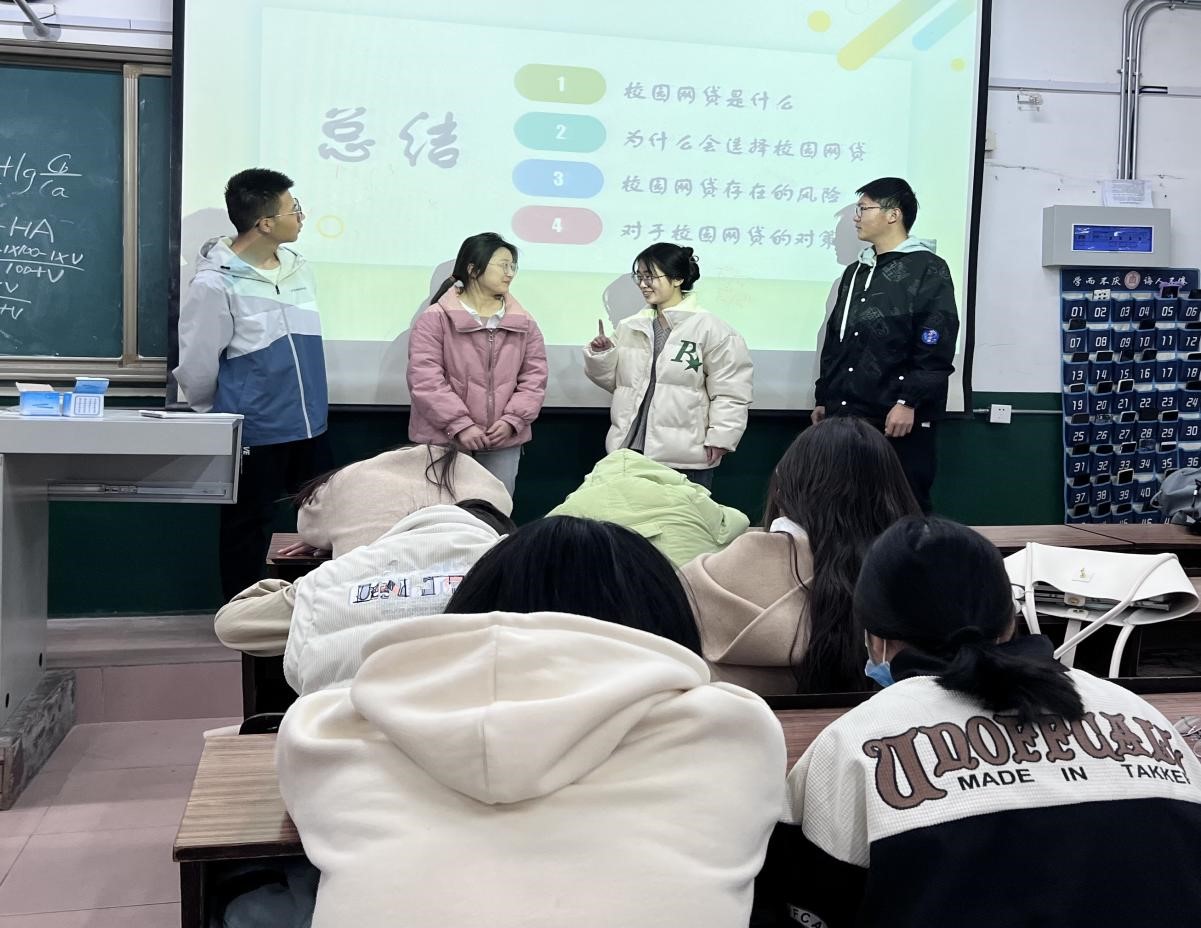 2022级化学师范五班开展校园反诈骗知识宣讲。活动伊始,团支书引用了数例大学生盲目贷款和不理性消费的案例引入主题,一例例真实的案件让同学们自觉接受了健康消费观念和校园贷款陷阱的含义与重要性,并投入到接下来的知识宣讲中。接着团支书邀请班级中一位缺乏防诈骗意识的同学上台分享他的经历和意见。为了更好的让反诈意识深入人心,团支书王悦宁随机选取一名同学上台进行知识问答,不仅让宣讲气氛更加活泼,也巩固了反诈知识。最后,班级团干部一起进行了反诈宣讲总结。