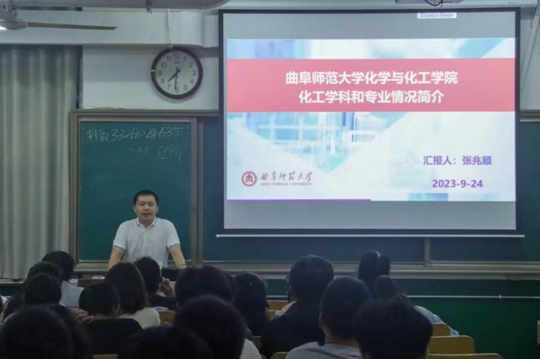 9月24日晚邀请刘西成老师、张兆顺老师、白啸老师、闫克鲁老师分别为化学(师范)专业、化学工程与工艺专业、材料化学专业、制药工程专业分专业的新生开展专业思政课堂,2023级全体学生参加本次活动。