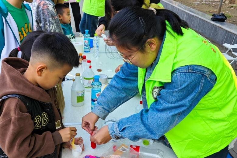 图为志愿者协助小朋友做实验