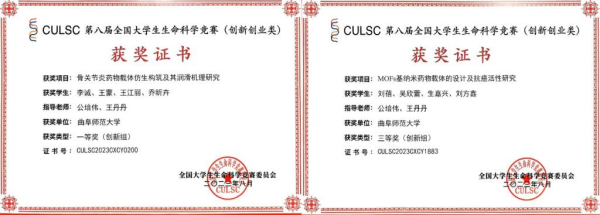 共有两个作品从初赛的众多作品中脱颖而出,经过山东省赛区复赛的激烈角逐,一路闯进全国决赛并斩获佳绩。这两个项目均由学院公培伟老师和王丹丹老师带队指导,其中“骨关节炎药物载体仿生构筑及其润滑机理研究”项目获得创新组一等奖,“MOFs基纳米药物载体的设计及抗癌活性研究”项目获得创新组三等奖。