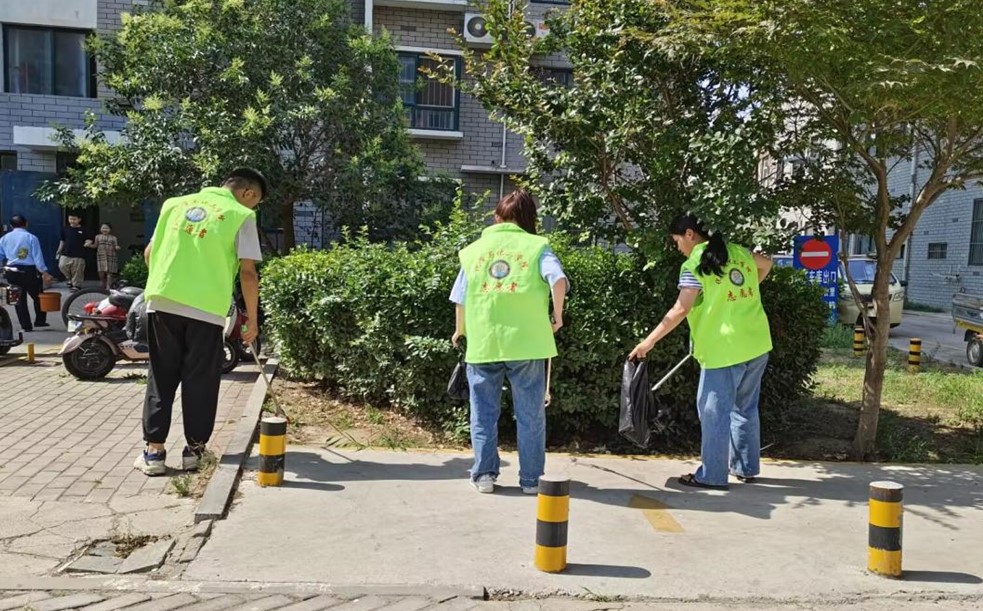 图为志愿者进行社区清洁活动